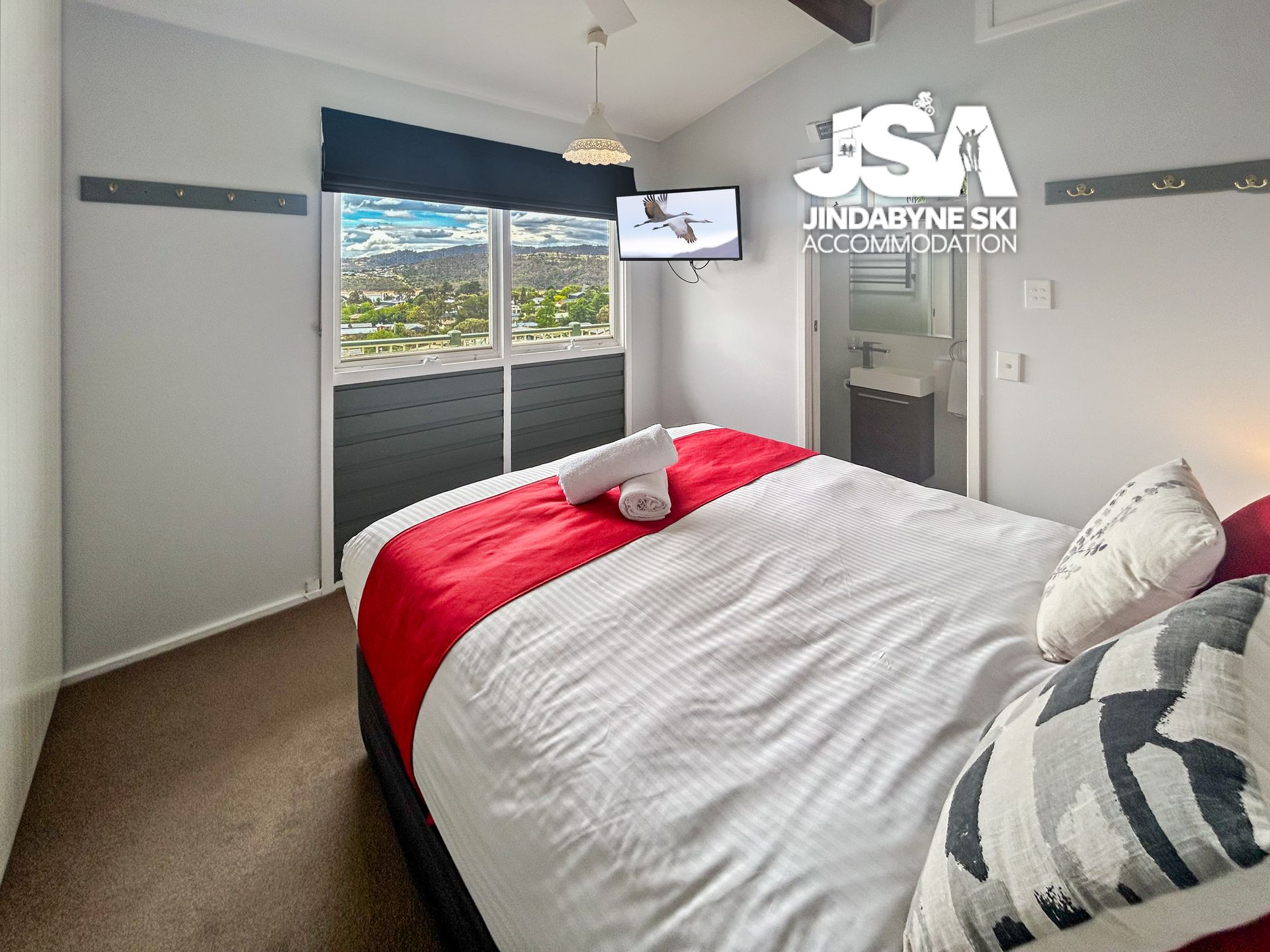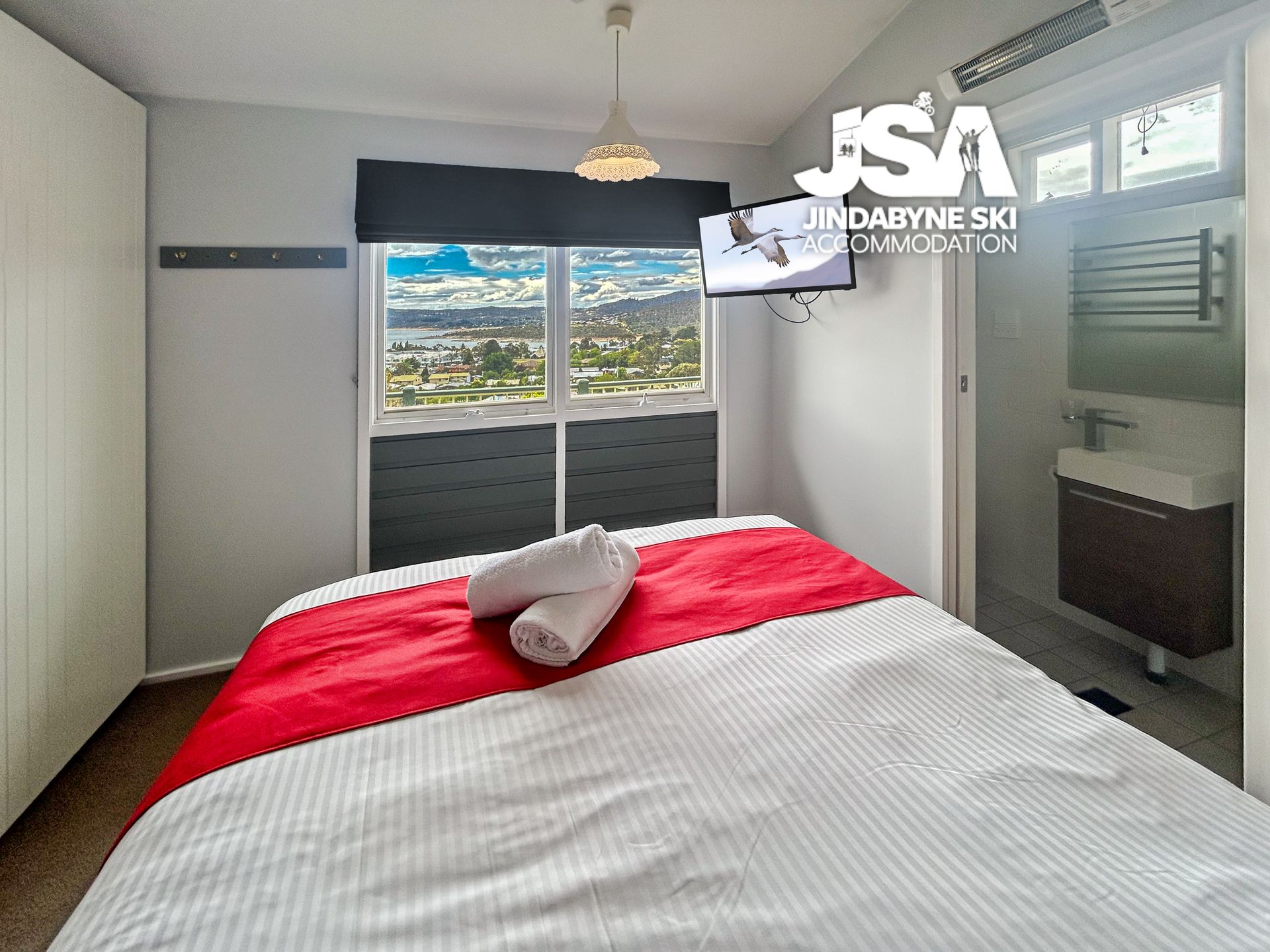 During winter nestle in and enjoy the cosy warmth of the beautiful gas fire with views across Jindabyne. This apartment is light and airy with expansive windows, feel relaxed in the open plan living equipped with Smart TV & Wifi or simply enjoy the stunning views of Lake Jindabyne and the mountains from your deck.
